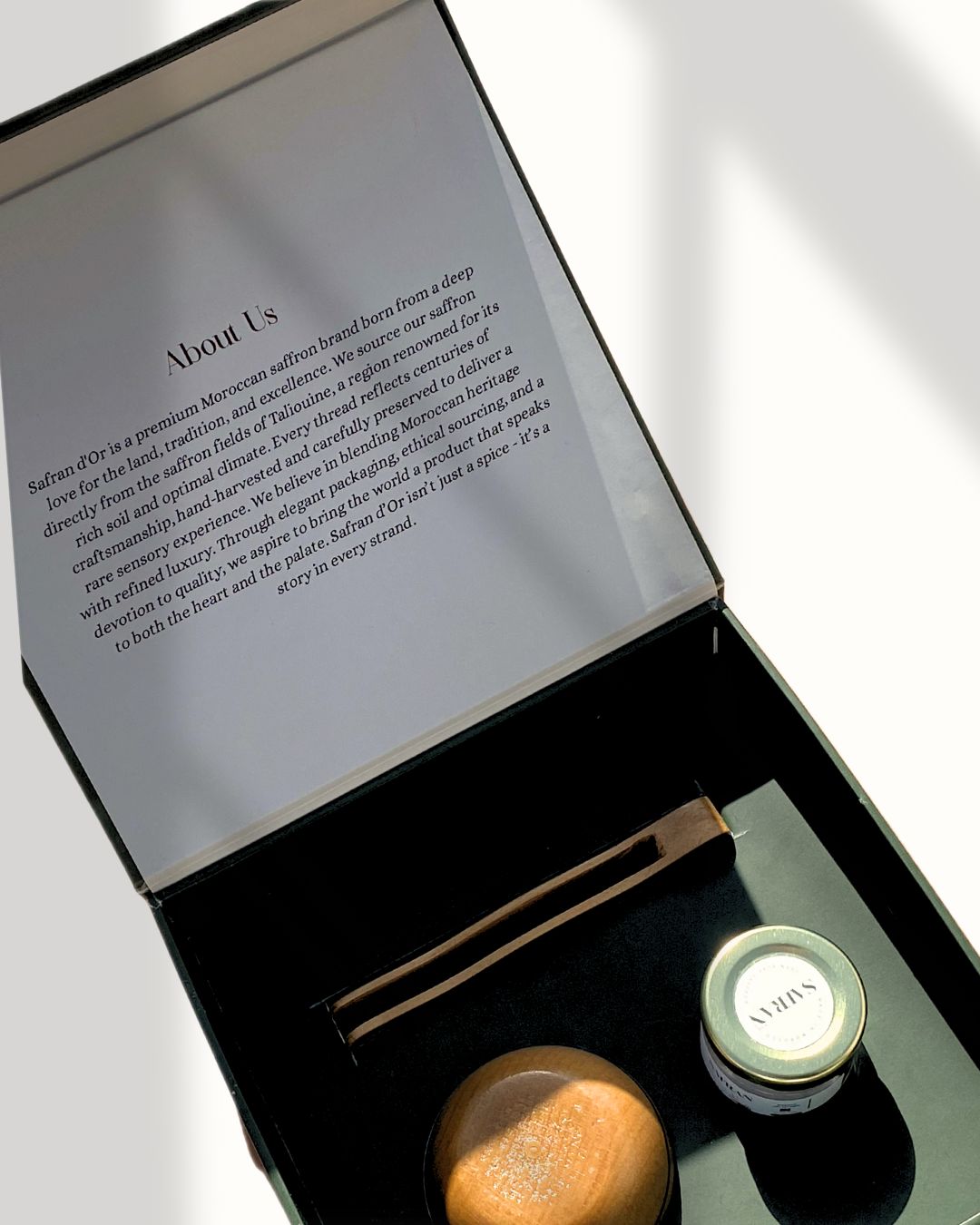 Includes 1g of saffron in a glass jar, with a handcrafted beech wood bowl and precision beech wood tweezers. An authentic Moroccan ritual in every detail.